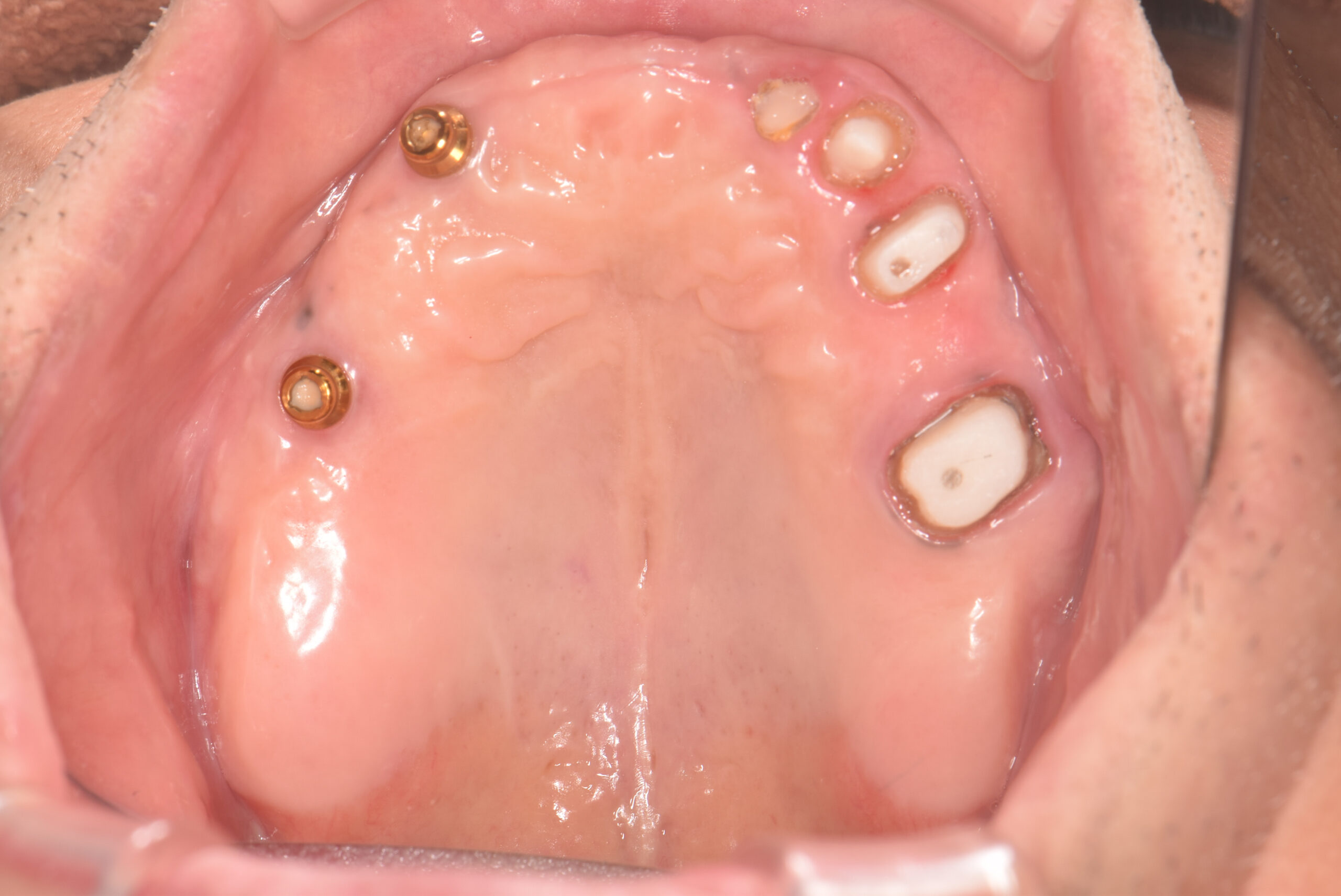 右上6・3番目にインプラント体を埋入し、その上に専用の義歯(オーバーデンチャー)をセット。左上3456にメタルボンドブリッジをセットした患者様の口腔内です。